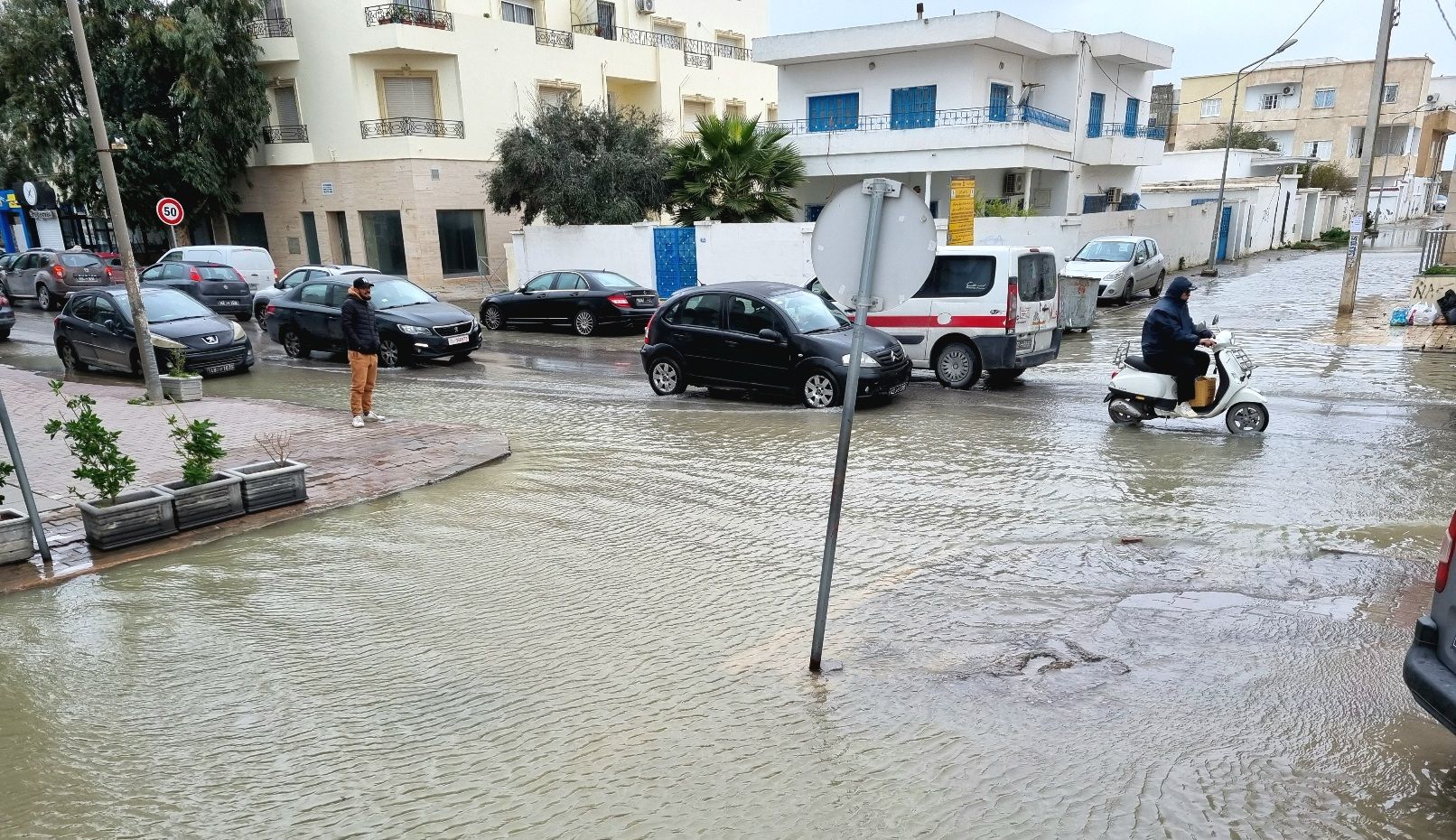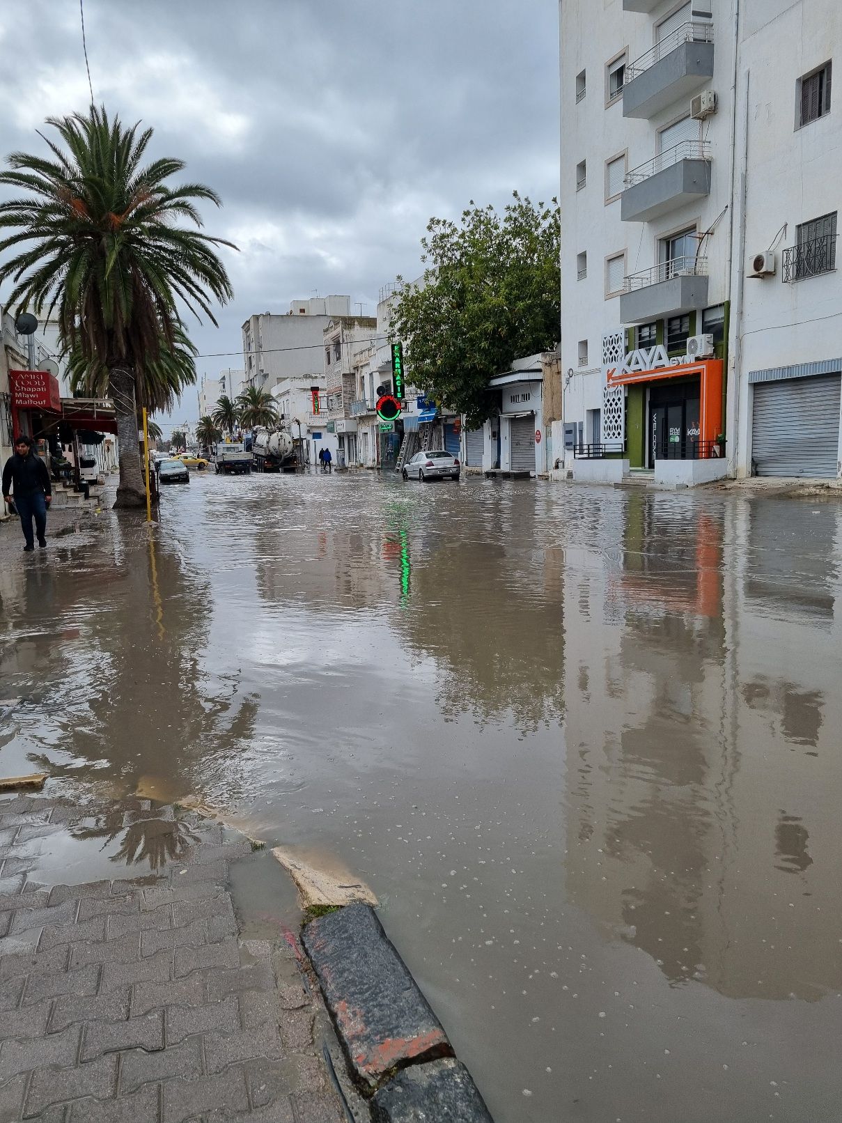 Myös Tunisissa tuuli ja kovaa. Merivesi oli noussut kaduille ja kävellen sai kiertää useita kortteleita että pääsi kuivin jaloin eteenpäin. Aikani kierrettyä taloja ja hyppineeni riittävästi kiveltä toiselle luovutin ja otin taksin.